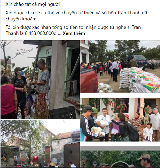 Đợt 1 là 1 tỷ, đợt 2 là 2,1 tỷ và đợt 3 là 3,353 tỷ. Trấn thành nói thế này, chúng tôi không phải cái gì giỏi giang hay làm chuyện to tát, ghê gớm gì nhưng chúng tôi làm bằng cả tấm lòng, có bao nhiêu giúp bấy nhiêu. Sau khi nghệ sĩ hoài linh bị công chúng bức xúc bởi ngâm khoản tiền từ thiện cho đồng bào miền trung lên tới 14 tỷ đồng, đến lượt danh hài trấn thành bị cộng đồng mạng thắc mắc về khoản tiền 4,7 tỷ. Trấn thành (sinh ngày 5 tháng 2 năm 1987), tên đầy đủ là huỳnh trấn thành, là một nam nghệ sĩ hài, diễn viên điện ảnh, người dẫn chương trình, nhà làm phim, đạo diễn, biên kịch người việt nam. Giữa lúc cả showbiz việt đang 'râm ran' về chuyện từ thiện, chiều nay, mạng xã hội tiếp tục xôn xao việc bài viết của nam mc trước đó chia sẻ về số tiền từ thiện 4,3 tỷ sẽ gửi cho ca sĩ thủy tiên.