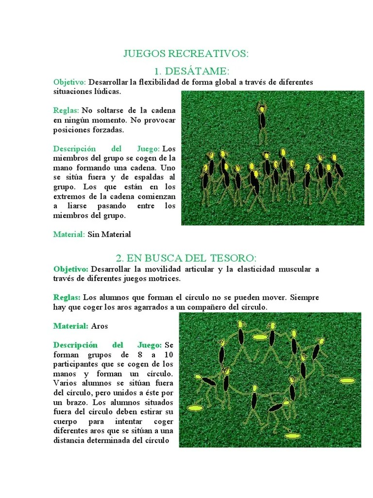 Cuando el del centro pilla a uno del círculo invierten sus papeles. Algunas de las reglas de estos juegospre deportivos son semejantes a la del juego deportivo y en ocasiones la idea parcial o total de un juego brinda la imagen concordante con un determinado deporte: Se denominan juegos recreativos a toda actividad que tiene como finalidad el placer en momentos de ocio. Los juegos recreativos tradicionales son dinámicas heredadas que pueden o no encontrarse relacionadas con culturas determinadas; Ejercicio recreativo sometido a reglas, y en el cual se gana o se pierde.